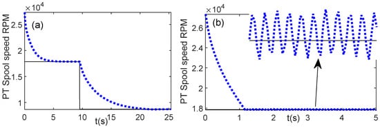 Gain scheduling reference graphs can be used to investigate the appropriate gains values which result in a stable response system. To investigate this behavior, constant gains tuning is selected from Figure 11 and Figure 17. Figure 18a illustrates the controller response using the constant gains [Kp Ki K1 K2 K3] = [2 4.2 0.0008 720 0.000004] for Case 2. It shows that the system is stable, when time needed to achieve the target PLA is 25.35 s. Figure 18b illustrates the controller response using the constant gains [Kp Ki K1 K2 K3] = [3 6.3 0.001 650 0.0002] for Case 2. It shows that the system exhibits an oscillation with constant amplitude in the power turbine speed spool response. This kind of system response is not expected, since the controlled variable will not reach a stable condition. Both gains have been selected within the area of gain scheduling, but the results do not always exhibit the desired stability.