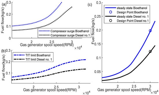 Comparison of diesel No. 1 and bioethanol; (a) compressor surge limit; (b) TIT limit; (c) steady state operating line.