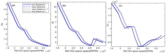 This section investigates the effect of using the bioethanol on the proposed gain scheduling control system. Figure 21 shows the results of the scheduling of the gains of Kp, Ki, K1, K2, and K3. It shows that K3 indicates a significant difference between the diesel No. 1 and bioethanol. This is because the value of K3 depends on the value of the fuel flow, , where for the bioethanol, the mass flow has significantly increased, as shown in the fuel boundary graph.