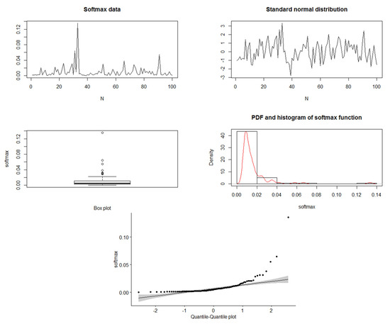 It has been noted in the real world that the actual R.V. may be continuous in disposition, but discrete when we observe it, for example in a hospital, the number of days a patient stays or a patient survives after treatment. Accordingly, it is appropriate to fit these positions by discrete distributions developed from continuous distributions. One of the most well-known functions in engineering and science is the softmax function. It has usage in many fields such as game theory [11,12,13], reinforcement learning [14], and machine learning [15,16]. This normalized exponential function is used to transform a vector y = ( y 1 , y 2 , , y N ) t R N into a unit sum vector ( 0 , 1 ) N as follows