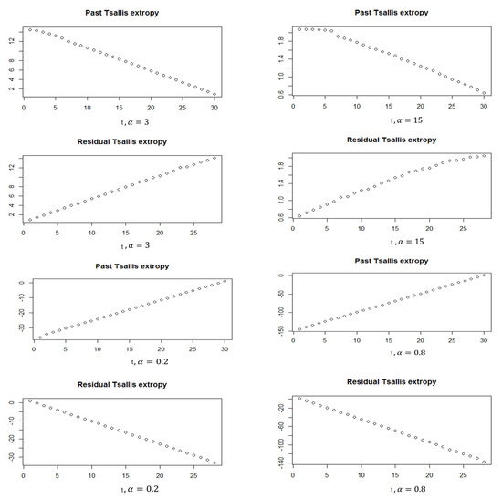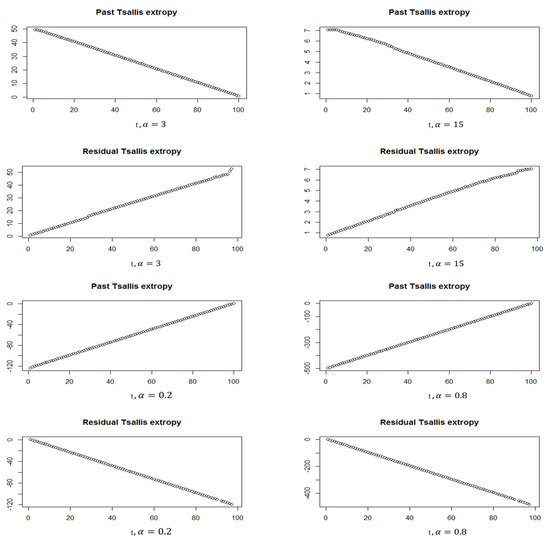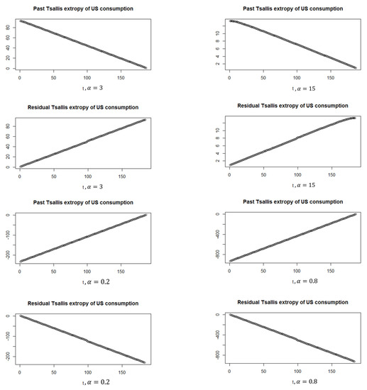 Moreover, Figure 8 shows the past and residual Tsallis extropy of the softmax U.S. consumption data, which can be noted as follows: By increasing t, the past Tsallis extropy decreases (increases) for α > 1 ( 0 < α < 1 ) . Furthermore, the residual Tsallis extropy increases (decreases) for α > 1 ( 0 < α < 1 ) .