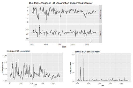 Figure 5. Quarterly changes in U.S. consumption and personal income data from 1970 to 2016 and the corresponding softmax data.