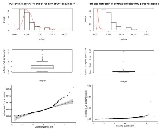 This part presents the quarterly changes in U.S. consumption and personal income data from 1970 to 2016. First, we want to discuss the softmax data obtained from our data. Figure 5 displays the U.S. consumption and income data and the corresponding softmax data. Figure 6 shows the data analysis of the softmax U.S. consumption and personal income, such that the mean of softmax U.S. consumption is 0.00534759 and the variance is 0.000011557 and the mean softmax of U.S. personal income is 0.00534759 and the variance is 0.0000149023. Moreover, the extremely standardized residuals (on both ends) are larger than they would be for normal data.