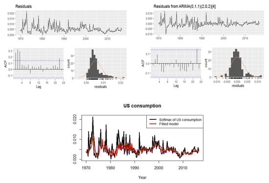 In Figure 7, based on the softmax U.S. consumption data, we see the residuals of the data before fitting them to a preferred model. Therefore, there are significant spikes in the ACF according to its residuals. Then, our aim now is to find a suitable model based on the ACF. Correspondingly, Figure 7 shows the residuals of the model fit to the data. Thus, the best model that fits the data is A R I M A ( 0 , 1 , 1 ) ( 2 , 0 , 2 ) 4 with p-value = 0.1502, AIC = 350.51, and it accepts the Ljung–Box test. Accordingly, all the spikes are within the significant ACF limits, except for a single spike that exceeds a small limit. Note that the general form of a seasonal ARIMA model is A R I M A ( p , b , q ) ( p , b , q ) s , where ( p , b , q ) s and ( p , b , q ) are the seasonal and non-seasonal part of of the model, respectively, and s is the number of observations per year.