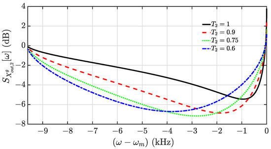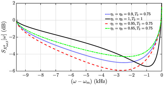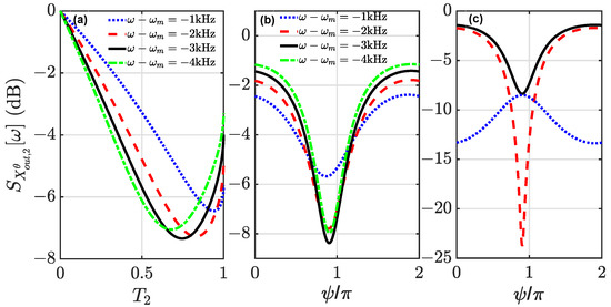 To clearly present the improvement of the squeezing level and the bandwidth with the use of the coherent feedback loop, we numerically analyze the spectrum. For the choices of values of the optomechanical parameters, we follow the experimental setup in reference [49], in which , , , , and . Additionally, under the constraint of the phase angle in Equation (16), the frequency range of squeezing is related to the detuning . For example, we could take to achieve the squeezing below the frequency of the oscillator, i.e., . The positive detuning should be taken into account, such as , for the squeezing above the frequency of the oscillator, i.e., . In Figure 2, we numerically plot the squeezing spectra as a function of frequency for several different values of transmissivity , under the assumption of . When , it is the case of squeezing without the coherent feedback. It is seen that the coherent feedback begins to work with . This clearly shows that the coherent feedback can improve the squeezing performance of the output field compared to that of the uncontrolled case, including the squeezing level and bandwidth.