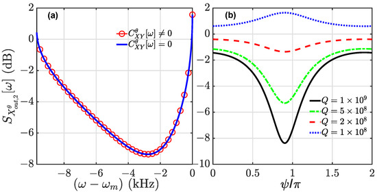 Note that the phase angle depends on frequency. Homodyne detection of the output field with the frequency-dependent homodyne phase is realizable, e.g., through a variational-output interferometer [3]. In practice, the mechanical factor reaches values up to in the platform using the soft clamping technique [49,50,51]. In this case, the condition for squeezing should be fulfilled. This is realizable by choosing a positive or negative value of .
