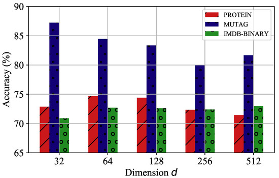 We further investigated the effect of two hyperparameters (dimension d and pooling ratio r) on the pooling model, GMAPS, by considering the PROTEIN, MUTAG, and IMDB-BINARY datasets with various settings. Figure 5 shows that for the PROTEIN and IMDB-BINARY datasets, too large and too small dimensions diminished the accuracy, and 128 was the optimal choice. However, for the MUTAG dataset, due to its relatively simple graph number and structure, a lower dimension catered to its node representations, and the accuracy decreased instead as the dimension rose. The hyperparameter analysis of the pooling rate r is presented in Figure 6. It is shown that for the three experimental datasets, the accuracies improved with increasing pooling rate, which means that the pooling rate cannot be set too small; otherwise, most of the graph structure information will be lost, and, thus, the accuracy in the graph classification tasks will be hampered.