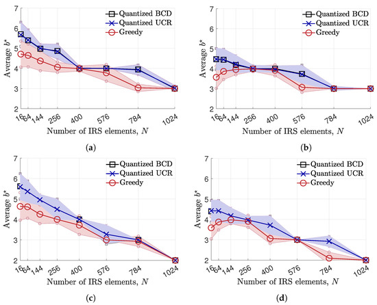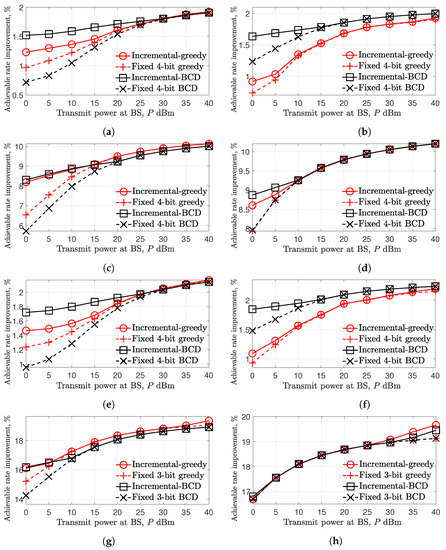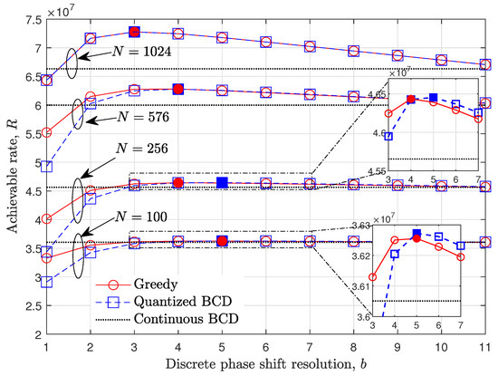 - In the fixed discrete phase shift resolution, two suboptimal algorithms to find the optimal discrete phase shift values, namely the greedy and BCD algorithms, are introduced. From the simulation results, some meaningful observations on these two sub-algorithms are verified as follows:Observation 1: When N is relatively small, the BCD algorithm achieves a higher achievable rate than the greedy algorithm in a low signal-to-noise ratio (SNR) regime.Observation 2: When N is sufficiently large and is small, the greedy algorithm outperforms the BCD algorithms in a high SNR regime.