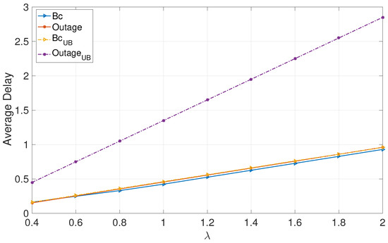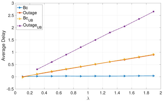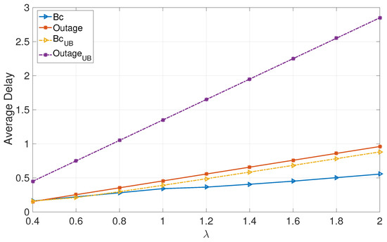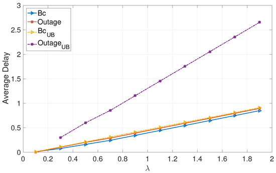 Finally, the Laplace transform of the queue size PDF is computed using (16), which in turn facilitates obtaining the average queue size at user i. Note that although is expressed in (16), it is still a recursive form. Therefore, the obtained expression for the average queue size delay contains the unknown term , which is why a closed form cannot be obtained. Subsequently, an upper and a lower bound on the average queue size of user are formally characterized in the next theorem.
