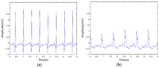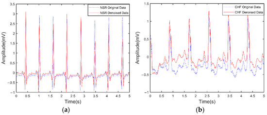 ECG signals with attenuated noise. (a) Normal ECG signal; (b) CHF ECG signal. The wavelet basis function is ‘bior2.6’ and the number of wavelet layers is 8.