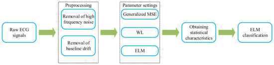 This study focuses on proposing an automatic CHF detection method based on the generalized multiscale entropy-wavelet leaders and extreme learning machine. The technique used for ECG signals classification and the steps can be divided into five parts in Figure 2. Firstly, the original ECG signals are extracted from the physiological database. Next, preprocessing is performed to remove noise and baseline drift. Then, the effect of parameter settings on the model is obtained according to the generalized MSE and the WL algorithms. Subsequently, suitable parameters are selected to obtain statistical features. Finally, the features are fed into the trained model for the classification and diagnosis of CHF patients.