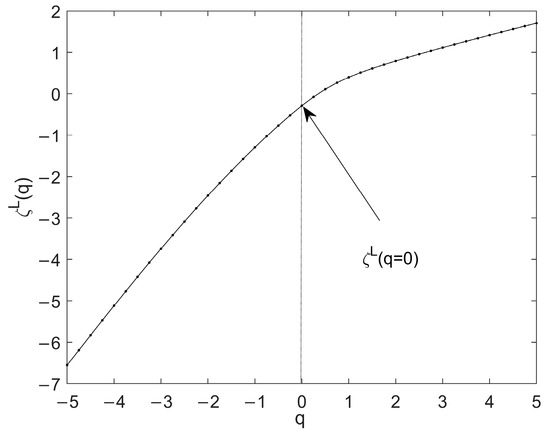 A schematic representation of the curve of one time series is shown in Figure 4, where an obvious inflection point appears near . This means that is not a linear function of , so the time series is multifractal.