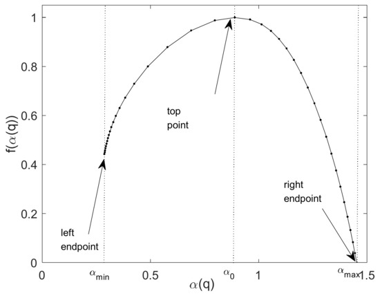 Figure 5 shows a schematic representation of the multifractal spectrum of the same time series based on WL in Figure 4. For the left endpoint of the multifractal spectrum, we use the singularity exponent to denote the corresponding horizontal axis of this point; it reflects the degree of large fluctuation of the signals. is the singularity exponent of the top point of the multifractal spectrum and corresponds to the most probable probability subset of the time series. The right endpoint with , reflects the degree of small fluctuation of the signals. The spectrum width reflects the uneven degree of fluctuation of the signals.