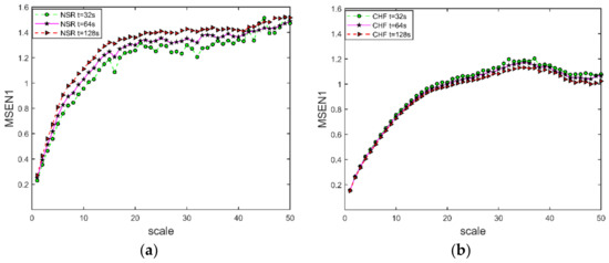 MSEN1 curve at different segmentation time. (a) NSR ECG signal; (b) CHF ECG signal. The embedding dimension , scale , and similarity tolerance ( is the standard deviation of the time series after coarse granulation).