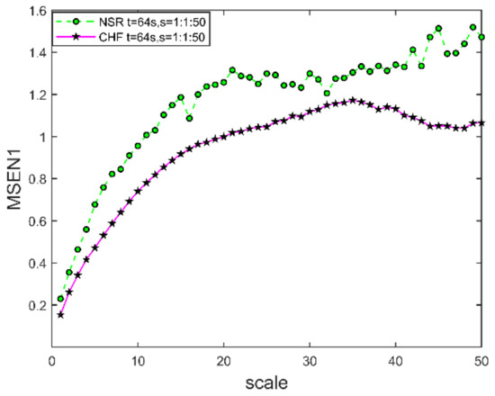 We plotted the MSEN1 curve for the ECG signals at scale as shown in Figure 8, where s and . The entropy values of the coarse-grained time series from healthy subjects are significantly higher than those of the CHF. Therefore, coarse-grained time series from healthy subjects at large time scales may be more complex. This finding is consistent with noise [4] ( noise is generated as follows: we start with uniformly distributed white noise, we compute the fast Fourier transform (FFT), and after imposing an distribution on the power spectrum, we compute the inverse FFT.) containing complex structures on multiple time scales. We use entropy methods to quantify the dynamics of each coarse-grained time series. We found an overall increasing trend in the magnitude of entropy values in the scale 1 to 20 range and stabilization to relatively constant values in the scale 20 to 50 range. However, the entropy values of coarse-grained time series from NSR were significantly higher than those of CHF. This suggests that the normal ECG signal data is more complex and the ECG signal from congestive heart failure is more regular.
