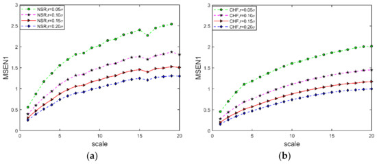 MSEN1 curve at different similarity tolerance. (a) NSR ECG signal; (b) CHF ECG signal. The embedding dimension , segmentation time s, and scale .