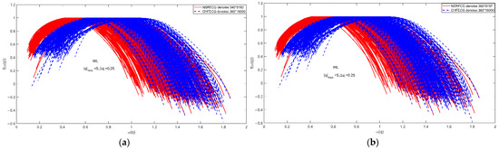 Figure 10a shows the WL-based multifractal spectrum for set A with 540 groups of NSR ECG signals of 8192 points and 360 groups of CHF ECG signals of 16,000 points, where the ‘db3’ wavelets are and . For ‘db3’, the number 3 refers to the number of vanishing moments. The NSR and CHF signals are sampled by different sample frequencies, so we choose the signal of s (8192/128 = 64, 16,000/250 = 64) for NSR and CHF ECG signals, which results in the two different lengths of the signals 8192 and 16,000. When we do the simulations, we choose the same parameters for them, so the scale range is determined by the length 8192. The length of the wavelet filter is of ‘db3’. Thus, when we choose the parameter for the range of scales, we fix the maximum scale by choosing the largest integer that is not greater than , i.e., . In the simulations, we use and . Figure 10b shows the WL-based multifractal spectrum for set B, where the ‘db3’ wavelet is , and there are differences between the two ECG signals of the same sample numbers 360 groups, respectively.