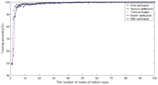 It can be seen from Figure 11 that the classification accuracy of the training and test sets gradually increases as the number of nodes of the hidden layer increases. The accuracy of the five-times cross-validation gradually increases to 100% when . The classification accuracy of the training set with node numbers from 20 to 70 is shown in Table 2. It can be observed from Table 2 that the best results are obtained for the 5-fold training set when . Considering the running time, is chosen as the optimal number of hidden layer nodes.