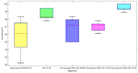 The results of 5-fold cross-validation are shown in Table 7, and the associated box plot is shown in Figure 12 to display the influences of the different algorithms on the accuracy of diagnostic results. One can conclude that each classifier has high accuracy (>95%) because of the distinguishable feature extracted in the previous stage of work. The highest overall accuracy of 99.56% correct detection of CHF is obtained in the results of the generalized MSE-WL-based detection method with ELM classification. Therefore, based on the overall classification correctness, it is concluded that the generalized MSE-WL feature extraction method can be applied to CHF automatic diagnosis. The extracted features have a good performance on multiple classifiers.