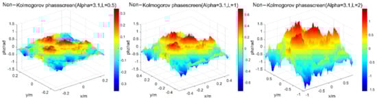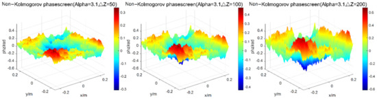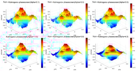 Firstly, a square phase screen with length and width of 0.5 m is simulated. When the number of grids is 256 × 256, the wavelength of light wave is 0.532 μm, the structure constant of atmospheric refractive index is [19], the transmission distance is set as 1000 m, the phase screen spacing as ∆z = 100 m, regardless of the internal and external scales of turbulence, and the power laws of three-dimensional spectrum are taken as = 3.1, 3.3, 3.5, 11/3, 3.9 and 4.3, respectively, the simulations of Non-Kolmogorov turbulent phase screen by the power spectrum method are shown in Figure 3.