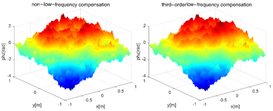 The low frequency compensation is analyzed. When the wavelength of the light wave is set as = 0.532 μm, the phase screen spacing is set as 100 m, the transmission distance is set as 1000 m, the width of phase screen is 2 m, the number of grids is 256 × 256, the power spectrum power law = 3.1, and the atmospheric refractive index structure constant is , the simulation results of non-low-frequency compensation and third-order low-frequency compensation are shown in Figure 7 and Figure 8, respectively.