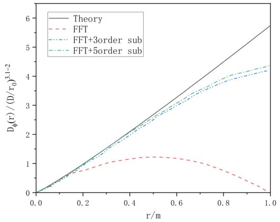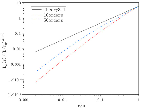 In order to analyze the performance of the phase screen generated by Zernike polynomial method, the phase structure function was also used for statistical analysis. The phase screen generated by several different polynomial orders was statistically analyzed and compared with the theoretical value of atmospheric turbulence phase structure function. The comparison results are shown in Figure 14.