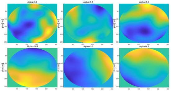 When being similar to the simulation process of the power spectrum method, namely, the atmospheric coherence length = 0.1 m, phase screen width 0.5 m, grid number 256 × 256, light wave wavelength 0.532 μm, regardless of the internal and external scale of turbulence, the power law of the three-dimensional spectrum = 3.1, 3.3, 3.5, 11/3, 3.9 and 4.3, respectively, and the order of Zernike polynomial was selected to be 10 for simulation, the simulations of non-Kolmogorov turbulent phase screen by the Zernike polynomial method are shown in Figure 10.
