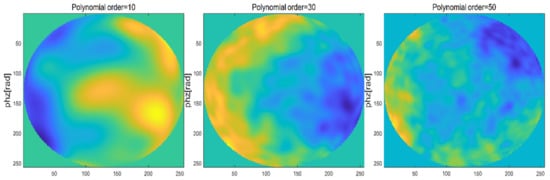 When changing the order of Zernike polynomial, that is the phase screen width is 0.5 m, the mesh number is 256 × 256, the wavelength of light wave is 0.532 μm, the atmospheric coherence length = 0.1 m, the power law = 3.1, and the orders are 10, 30 and 50, respectively, the simulations of Zernike polynomial phase screen with different orders are shown in Figure 13.