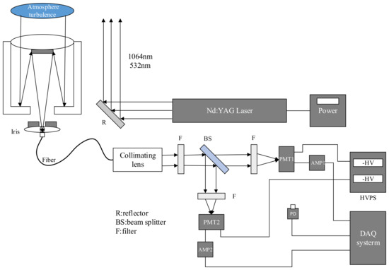 Figure 15 shows the schematic diagram of the Mie-scattering lidar system used. The system uses the Nd: YAG-pulsed laser as the laser source, and emits the pulsed laser beam at wavelengths of 1064 nm and 532 nm into the atmosphere, then the laser interacts with the molecules and particles in the atmosphere as well as the atmospheric turbulence to generate the backscattering return signal, which is received by the large aperture telescope. Through the iris, optical fiber and collimating lens, the return signal incidents into the spectroscopic system, in which, the 532 nm return signal is divided into two channels with different energies and is, respectively, detected by two photomultiplier tubes (PMT). The purpose of the two channels is to explore the effects of return signals with different intensities on atmospheric turbulence in later experiments. The PMTs convert the received optical signals into electrical signals, which are amplified by amplifiers and sent to the data acquisition and processing system. The photoelectric detector of the lidar works in the analog mode, and the output of PMT is directly connected with the high speed, high gain and low noise amplifier circuit to achieve impedance matching and signal amplification.
