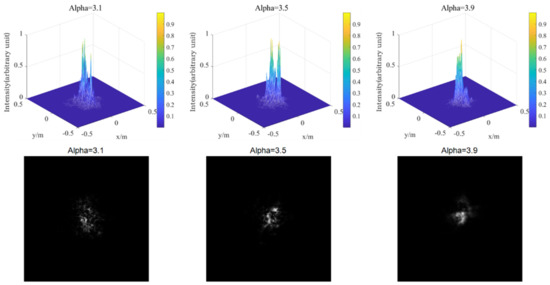 According to Equations (32) and (33), the change of intensity of Gaussian beam propagating 1 km in turbulent atmosphere is simulated. Therefore, the laser is set as fundamental mode Gaussian beam, taking laser wavelength = 0.532 μm, phase screen size = 0.5 m, beam waist radius = 20 mm, grid number × = 256 × 256, and setting a phase screen at = 100 m in the distance of 1000 m, the power law = 3.1, 3.5, and 3.9, the atmospheric refractive index structure constants are and , respectively. The power spectrum method is employed to simulate the distribution of light intensity. In fact, the laser used in the laboratory has wavelengths of 1064 nm and 532 nm, energy of 150 mJ, frequency of 10 Hz, and average power of 1.5 W. The initial light intensity is the ratio of the power to the phase screen area, which is 6 W/m2 through calculation. It should be pointed out that the light intensity calculated by simulation in the following figure is a relative value, which is the ratio of the light intensity of each point to the origin.