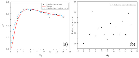From Figure 18a, the simulated scintillation index in non-Kolmogorov turbulent atmosphere is in good agreement with the theoretical value. With the continuous increase of Rytov variance, the scintillation index first increases to a maximum value, then slightly decreases, and finally tends to a stable value, which is the saturation phenomenon of light intensity scintillation mentioned above. Figure 18b shows the relative error between simulated non-Kolmogorov turbulent atmospheric scintillation index and theoretical value. It can be seen that the error is basically less than 10%, and the average relative error is 2.66% after calculation, which verifies the accuracy of simulation.