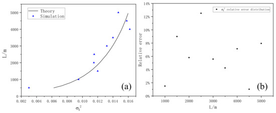 As can be seen in Figure 19 and Figure 20, the simulated scintillation index fluctuates around the theoretical value, and there is a good consistency between them, which preliminarily indicates the reliability and rationality of Mie scattering lidar when using non-Kolmogorov turbulence and can play a good guiding role in the subsequent practical detection. Figure 20b shows the relative error of simulated scintillation index with height. It can be seen that the relative error is basically less than 14% and most of it is less than 8%, indicating that it is feasible to use the parameters of the Mie-scattering lidar to simulate the fluctuation of light intensity. In the future, we will use simulated parameters for the equipment design and construction of the lidar system.
