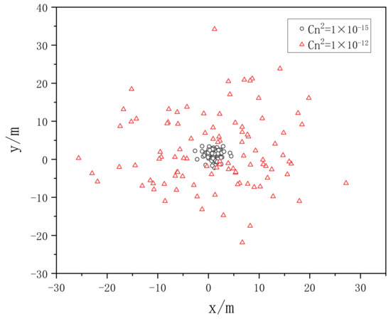 When the Gaussian beam wavelength = 0.532 μm, the phase screen size = 0.5 m, the beam waist radius = 20 mm, and the mesh number × = 256 × 256 are selected, the transmission distance is 1 km, a phase screen interval is set as = 100 m, and the power law is set as = 3.1 and 3.9, respectively, and the atmospheric refractive index structure constants are , , the distribution of spot centroid is simulated.