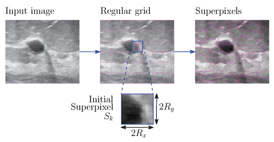 For the current study, local clustering means that a segmentation process must be developed on each k-th superpixel by using Expressions (8), (10) and (11). To that end, the input image is partitioned into regular grids (see Figure 1) with a size, where . The constraint must be respected, where is the k-th superpixel.