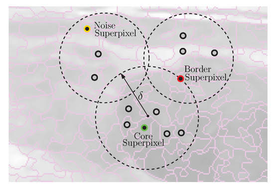 In addition, this figure depicts other parameters, for instance, the Core Superpixels, which are superpixels that are within the radius and have at least neighbors; the Border Superpixels, which are superpixels on the border, as well as the Noise Superpixels, which are superpixels that do not correspond to any of the previous types. DBSCAN is stated by the maximum radius of the neighborhood and the minimum number of superpixels in the neighborhood bounded by . In essence, the algorithm is a heuristic that analyzes and clusters the superpixels in terms of distance. This means that the algorithm includes all core superpixels that are within distance of each other in the same cluster and excludes border and noise superpixels of the interest clusters.