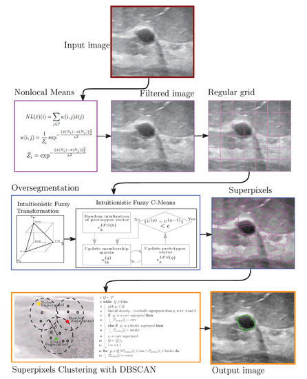 Reference [26], an interesting study that was carried out, was about a comparison between Deep Learning and Superpixels. According to the authors, Deep Learning Neural Networks were able to realize accurate segmentation; in contrast, the Superpixels retained the mass boundary information to a large extent. Both results are also important for breast masses’ segmentation; consequently, even if Deep Learning is a powerful paradigm, the virtues of traditional methods are still required. In support of the last contention, in this study, a processing scheme composed of three algorithms with high performance is introduced. It is based on algorithms such as Nonlocal Means filter [27], Intuitionistic Fuzzy C-Means [28], and Density-Based Spatial Clustering of Applications with the Noise algorithm, commonly known as DBSCAN [29]. Each of these algorithms has a particular role: Nonlocal Means filter improves image quality by reducing existing noise while the edges are preserved; the Intuitionistic Fuzzy C-Means algorithm performs the superpixel extraction with high edge adherence, and the DBSCAN approach clusters the superpixels in order to segment the breast masses. The contributions of this study are summarized as follows: