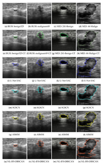 For the and metrics, a value close to unity suggests better segmentation, while for and , a minimum value represents the best performance. In considering this remark, the current proposal had the best efficiency for both breast mass types. In each specific case, , , , and for benign masses, and , , , and for malignant masses. It is worth noting that the current proposal had the lowest standard deviation. In general terms, it can be mentioned that after the introduced method, the performance order was the ASbSM, U-Net SAC, and SGSCN algorithms. Figure 4 presents a sample image pair of each database, their ground truths, and the segmentation developed by each evaluated algorithm. As shown in Figure 4u,v, the best tumor delimitation was provided by the proposed method, which strongly supports the quantitative results. It can be seen that the comparative methods achieved a good segmentation; however, they differ a little with respect to the manual segmentation.