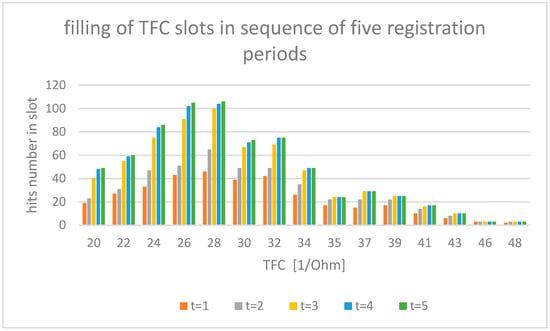 The experimental data used in this study were sourced from the AMULET research project [,,,], under which a multicenter, prospective, randomized, open-label and controlled, parallel group trial was conducted (ClinicalTrials.gov Identifier: NCT03476590) at nine locations throughout Poland. In total, 605 patients with heart failure were recruited. In our study, we examined electrocardiogram (ECG—electrocardiogram) and impedance (ICG— impedance cardiogram) curves recorded with the use of an ICG device (Cardioscreen 2000, Medis, Illmenau, Germany). This non-invasive diagnostic method allows one to collect a set of specific hemodynamic parameters, such as heart rate (HR—heart rate), stroke volume (SV—stroke volume), and thoracic fluid content (TFC—thoraric fluid content). In our analysis, TFC has been used as an illustrative example. The value of TFC is the inverse of chest impedance with unit (1/Ohm) and strongly depends on fluid content of the chest. The TFC is basic information used in the diagnosis of heart failure; because of fluid overload in the pathogenesis of HF exacerbation, early detection of fluid retention is of key importance in preventing emergency admissions. For such reason, our analysis took TFC into account as the most important parameter. TFC values were measured during a clinical examination of 605 patients, performed in a relaxed, seated position. The total number of measurements recorded here is 2860, with the number of individual patient observations differing for each patient within the measurement set. The results registered are illustrated in Figure 1. At least half of the patients were investigated several times, with the observation period lasting for up to 12 months per patient. All intervals of the investigated TFC value have been divided arbitrarily into 15 discrete value slots, as shown in Figure 1. The assumed number of slots must be greater than five to allow statistical analysis (especially χ2 tests) but not too high to avoid complexity of calculations. With computer calculation, we estimate that the amount of 15 slots allows for an acceptable accuracy of calculations. The time series was registered as follows: Due to the irregular flow of the measured data per patient, we adopted a registration period that was 31 days long for each slot. Each slot includes hits counted during measurements registered over a five-month period. Longer registration does not carry new results in TFC distribution. Hits registered during each single measurement period are illustrated in Figure 1.