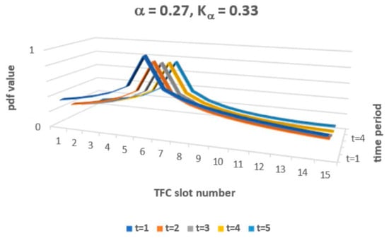 The solution of FFPE (9) allows value classes of functions P(x, t) that exceed 1 and that may also be lower than 0. So, for P(x, t) to be interpreted as a probability density function (pdf), one must adopt specific constraints for α and Kα to ensure proper pdf interpretation. The constraint applies just to solution classes in Equation (9). Now, one may simulate the obtained solution (9–11), which must obey the predefined constraint 0 ≤ Pα,Kα (x,t) ≤ 1 for a set of pairs {α, Kα}. The general constraint of 0 < α < 2 applies, as a rule, for fractional FFPE. The condition that P(x, t) is a decreased function of both arguments also imposes a constraint on the permissible pairs {α, Kα}. Figure 2 presents an example of the simulated Pα,Kα (x,t) with arbitrary values of α and Kα.