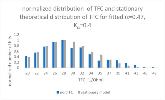Values of α and Kα placed inside Figure 3 have been calculated by means of root mean square error (RMSE) between measured experimental data and the theoretical “fat tail” distribution presented in Equation (12), closed for a time of observation as long as 5 months. One can see that the Hurst exponent is equal to α/2 = H = 0.235.