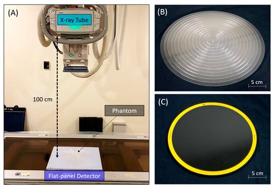 The experimental settings of the phantoms in a radiographic system. (A) The flat-panel detector was placed below the X-ray tube, and the source-to-detector distance was 100 cm. (B) The CSW phantom was designed with 14 step thicknesses and had a maximum diameter of 30 cm. (C) The CDR phantom was made with 144 circular details and had a diameter of 25 cm.