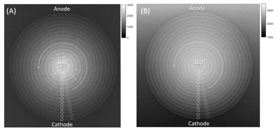 To evaluate non-uniform image quality, a recent study proposed a circular step-wedge (CSW) phantom with normalized mutual information (nMI), and results its demonstrated that the directional nMI metric could successfully reflect the non-uniform image quality caused by the anode heel effect []. However, it remains unclear whether the CSW phantom was a suitable tool to compare the non-uniform image quality between radiographic systems equipped with different anode angles. Therefore, the purpose of this study was to quantitatively compare the non-uniform image quality between two radiographic systems with different anode angles using both CSW and CDR phantoms.