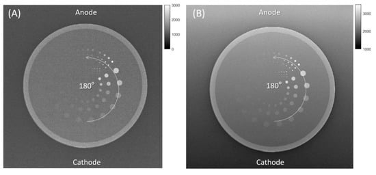 In radiographic systems, an X-ray tube design with a small anode angle has been clinically used to reduce the blurring effect and improve the sharpness of the object in radiographs, because the X-ray beam is produced with a small effective focal spot size on the anode. However, the small anode angle is known to induce the anode heel effect, where lower X-ray fluency and higher mean radiation energy are in the direction of the anode rather than the cathode []. The inhomogeneous distribution of X-ray photons is associated with non-uniformities in radiographic image quality; thus, previous studies have demonstrated that the signal-to-noise ratio (SNR) is lower in the direction of the anode of pelvic radiographs [,]. Because radiographic systems with different anode angles may exhibit different extents of the heel effect, and lower SNR in the anode direction may negatively influence clinical diagnosis for small and low-contrast lesions, it is important to understand how much percentage of image quality was decreased in the anode side and to compare the extent of non-uniform image quality between radiographic systems equipped with different anode angles.