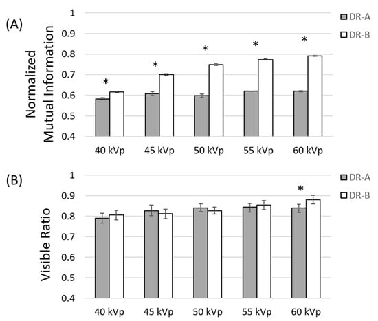 Comparison of normalized mutual information (A) and visible ratio (B) metrics at different kVp between two radiographic systems at 0.5 mAs. Asterisks indicate significant differences between the DR-A (Toshiba DRX-1603B) and DR-B (Toshiba DRX-3724HD) systems.