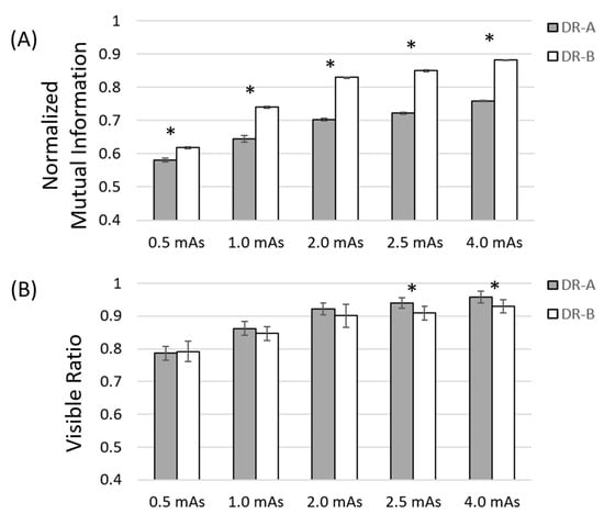 Comparison of normalized mutual information (A) and visible ratio (B) metrics at different mAs between two radiographic systems at 40 kVp. Asterisks indicate significant difference between the DR-A (Toshiba DRX-1603B) and the DR-B (Toshiba DRX-3724HD) systems.