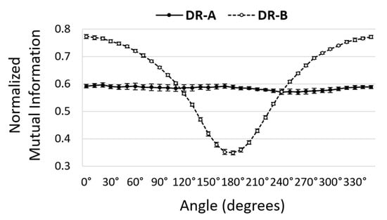 Comparison of directional normalized mutual information metrics at different angles between DR-A (Toshiba DRX-1603B) and DR-B (Toshiba DRX-3724HD) systems obtained using 40 kVp and 0.5 mAs. The nMI metrics were significantly different between the two systems in most orientations.