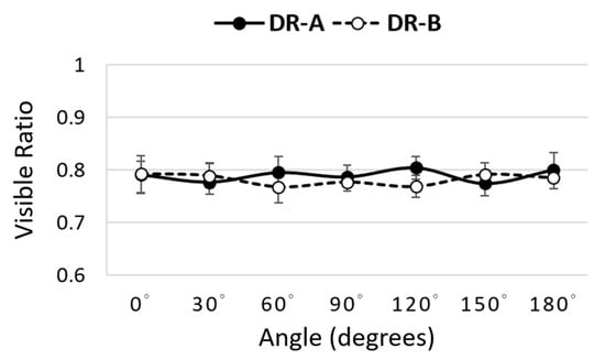 Comparison of directional visible ratio metrics at different angles between the DR-A (Toshiba DRX-1603B) and DR-B (Toshiba DRX-3724HD) systems obtained using 40 kVp and 0.5 mAs.