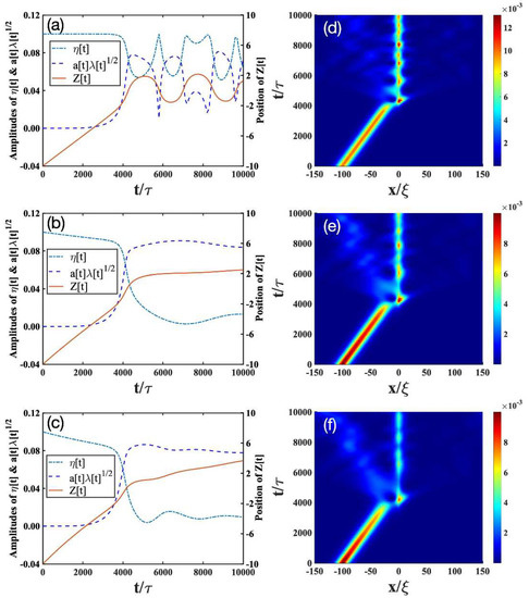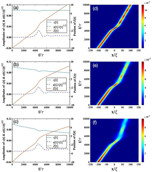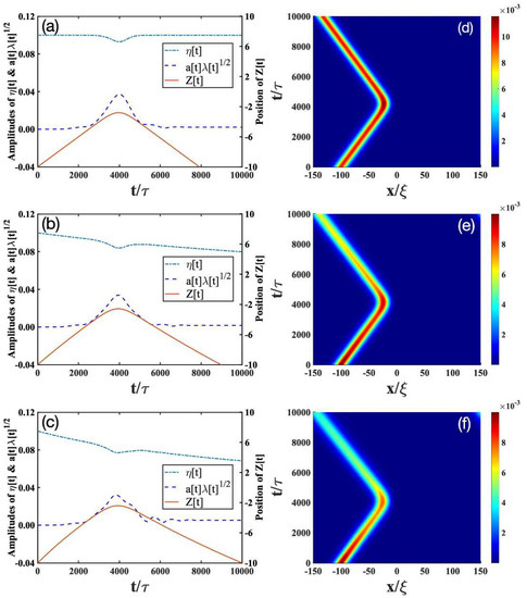 - Trapping scenario: In the absence of dissipation (Figure 2a,d), the bright soliton can be trapped by an impurity with a moderate mass (), as indicated by the position of the bright soliton (solid lines in Figure 2a). Furthermore, the impurity mode (dashed lines in Figure 2a) is strongly excited and begins to oscillate, whereas the soliton amplitude (dashed-dotted lines in Figure 2a) decreases drastically. This result is verified by the numerical simulations in Figure 2d. In the presence of dissipation (Figure 2b,c,e,f), the bright soliton can still be trapped by the impurity, but the oscillating behavior of the bright soliton begins to disappear. This can be understood, as the dissipation will destroy the low-energy excitations generated from the collisions of the bright soliton and the impurity.