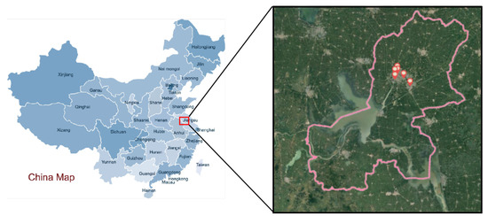 The locations of the air quality monitoring stations in the Huaian region (red marks).