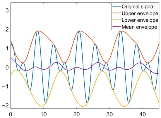 First, find all the maximum and minimum points of , and then, fit all the maximums and all the minimums through function fitting to obtain the upper envelope and the lower envelope . is the mean envelope of the original signal, which is the mean of the upper and lower envelopes: